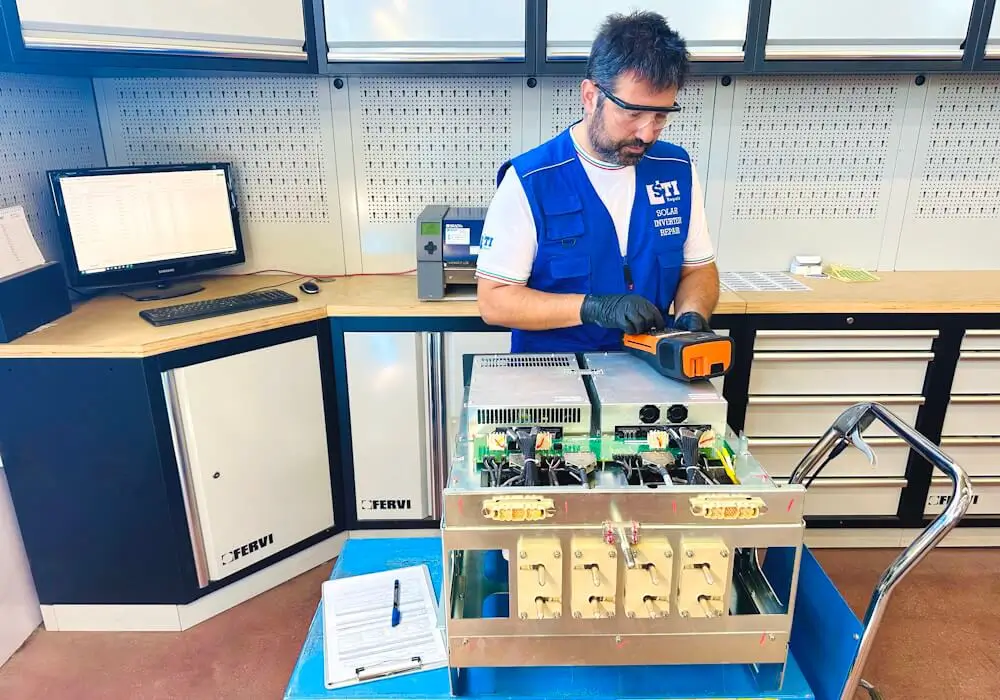Passata la fase di accettazione, l’inverter viene schedato e ogni fase tracciata. Il secondo step lo porta nell’area collaudo per una DIAGNOSI sotto carico, ossia l’inverter è messo in funzione per eseguire una serie di test volti a confermare il difetto segnalato dal cliente e ad identificare possibili problemi secondari o aggiuntivi. Questo metodo è progettato per fornire al tecnico incaricato della riparazione un quadro dettagliato delle condizioni dell’inverter, facilitando e velocizzando così le successive fasi di riparazione.